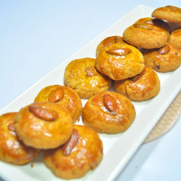 Divide dough into 12–14 equal portions, roll into balls, and flatten slightly Place on a lined or greased baking tray with space between cookies. Press one whole almond on top of each cookie. Using a pastry brush, lightly brush the tops with the yolk–milk glaze.