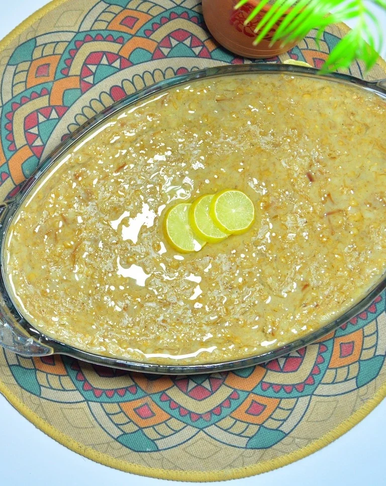 Ladle the Mutton Hareesa into bowls, garnishing with Lemon slices. Serve hot with extra ghee on the side for drizzling.