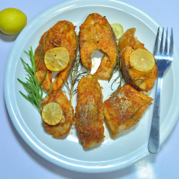 Remove the fish from the oven, let it rest for 2–3 minutes, then garnish with coriander and lemon slices, and serve hot.