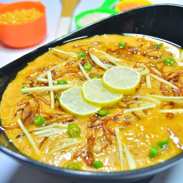 Reshewala Haleem is a rich, hearty, and velvety stew made from slow-cooked boneless chicken, wheat, lentils, and aromatic spices. This special variation of traditional Haleem includes shredded ("reshi") chicken and is cooked until the grains and meat blend into a luscious paste. Topped with caramelized onions, lemon, fresh coriander, it’s a wholesome dish especially enjoyed during winter or Ramadan.