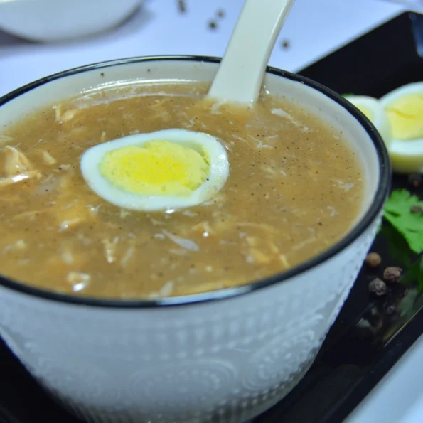 After boil take out chicken from stock and shred the chicken. Now add shredded chicken back to stock. Add black pepper & white pepper, chicken powder, white vinegar, soy sauce, chili sauce and egg. Stir quickly.